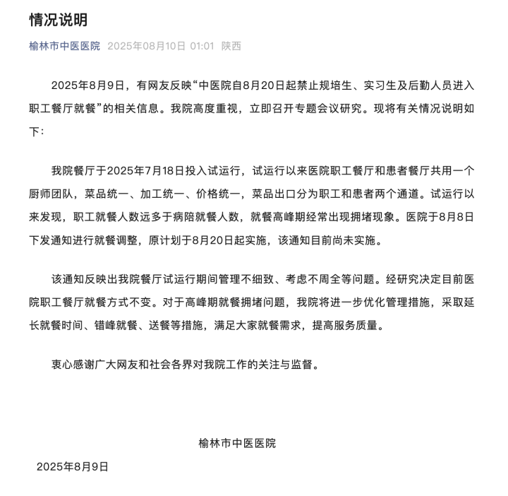 2025年8月9日,有网友反映“中医院自8月20日起禁止规培生、实习生及后勤人员进入职工餐厅就餐”的相关信息。我院高度重视,立即召开专题会议研究。现将有关情况说明如下: