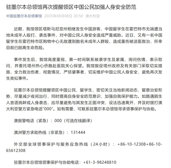 8月8日晚,“中国驻墨尔本总领事馆”官微发文提醒领区中国公民加强人身安全防范: